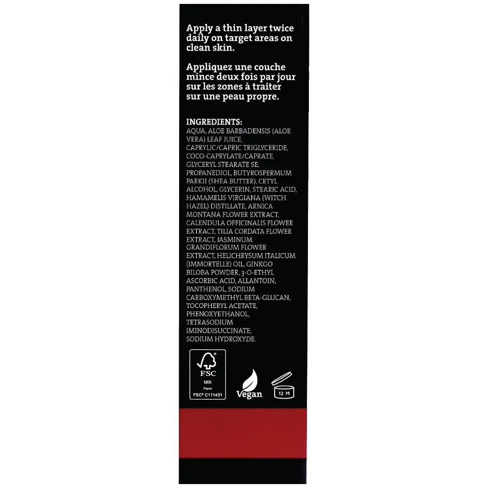 Aqua, Aloe Barbadensis (Aloe Vera) Leaf Juice, Caprylic/Capric Triglyceride, Coco-Caprylate/Caprate, Glyceryl Stearate SE, Propanediol, Butyrospermum Parkii (Shea Butter), Cetyl Alcohol, Glycerin, Stearic Acid, Hamamelis Virgiana (Witch Hazel) Distillate, Arnica Montana Flower Extract, Calendula Officinalis Flower Extract, Tilia Cordata Flower Extract, Jasminum Grandiflorum Flower Extract, Helichrysum Italicum (Immortelle) Oil, Ginkgo Biloba Powder, 3-O-Ethyl Ascorbic Acid, Allantoin, Panthenol, Sodium Carboxymethyl Beta-Glucan, Tocopheryl Acetate, Phenoxyethanol, Tetrasodium Iminodisuccinate, Sodium Hydroxyde.